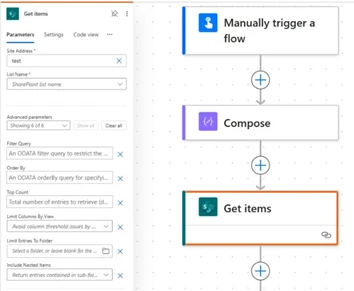 When the List rows is expanded, it will show the Parameters view directly inline, so that you can specify the parameters in the new designer same as you would previously would have done it with the previous version in the side pane. You will see additional actions such as Code view and More which will provide the same functionality that existed with the previous new version in the side pane, but all available inline in the current action/