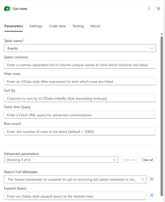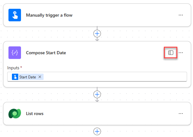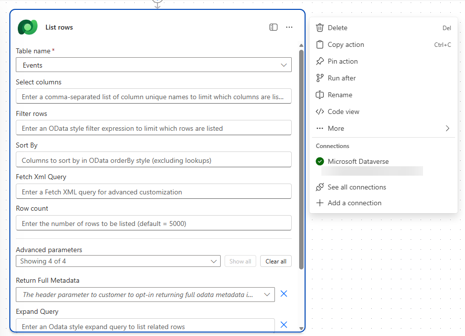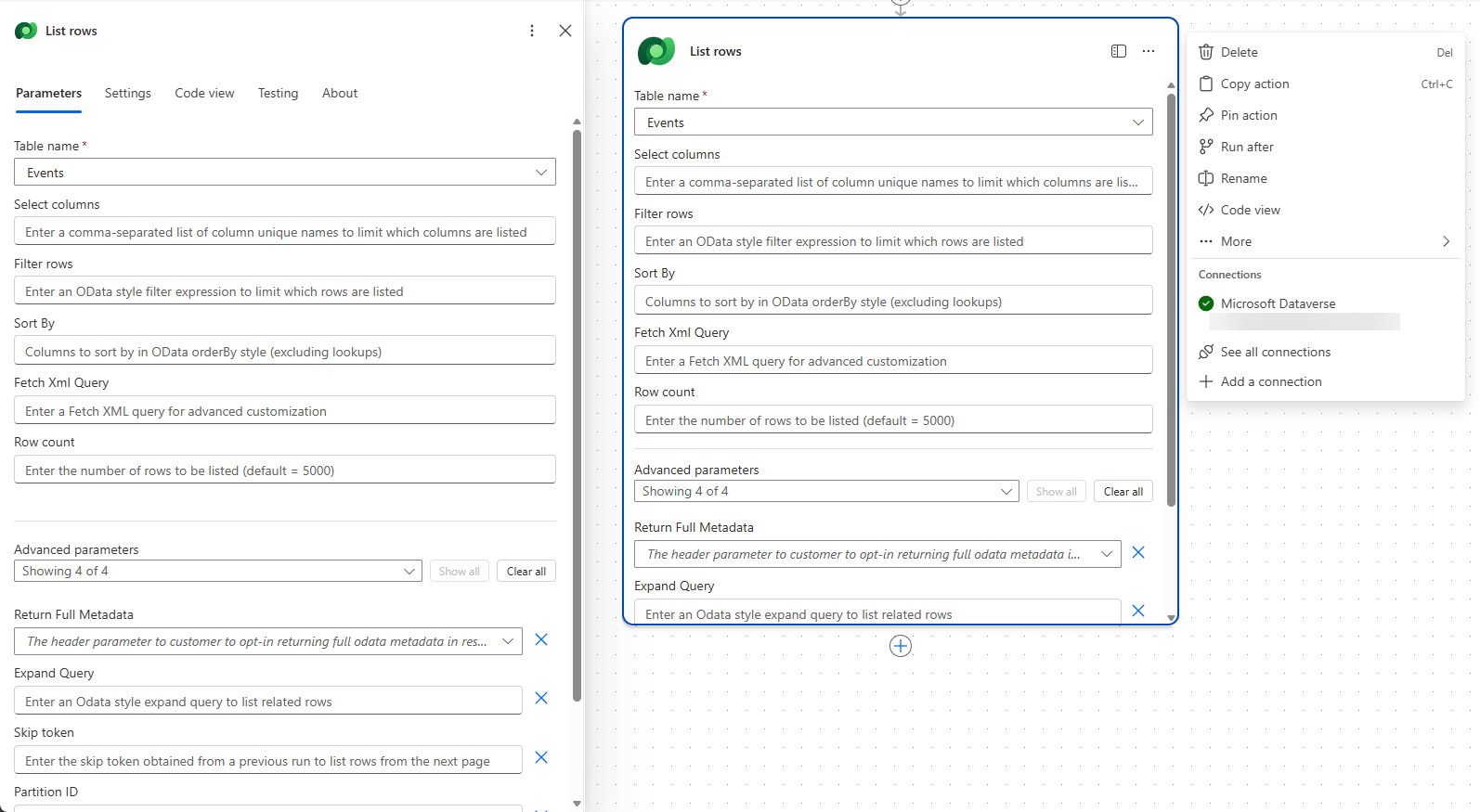 This allows you to use the parameters, settings, code view, testing and about functionality either in the side pane or inline within the actions or triggers themselves. The image below shows you the List rows action both inline and in the side pane with the more actions icon clicked so that it shows you the available actions you can use when working inline.